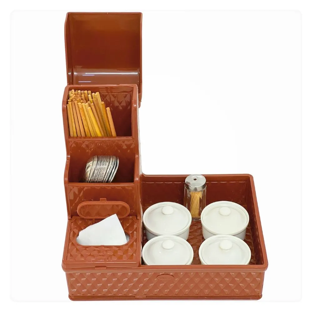 Không chỉ là một vật dụng phụ trợ, khay đũa hộp giấy gia vị hiện nay được xem là giải pháp tổ chức không gian bàn ăn toàn diện. Với thiết kế tích hợp gồm: ngăn đựng đũa, thìa, tăm, hộp giấy ăn và các lọ gia vị như nước mắm, tương ớt, tiêu… sản phẩm giúp bàn ăn luôn gọn gàng – sạch sẽ – tiện lợi cho cả thực khách lẫn nhân viên phục vụ.